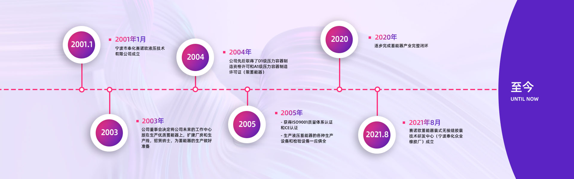 寧波市奉化賽諾歐液壓技術(shù)有限公司創(chuàng)建于2001年7月,是國(guó)內(nèi)優(yōu)秀的液壓蓄能器專業(yè)制造公司,制造設(shè)備齊全,檢測(cè)手段完善。同時(shí)也是探索蓄能器囊式結(jié)構(gòu)一體化的科研創(chuàng)新型企業(yè)。 2001年,公司董事會(huì)決定將公司未來(lái)的工作重心放在生產(chǎn)優(yōu)質(zhì)蓄能器上。公司一方面著手于廠房擴(kuò)建和生···